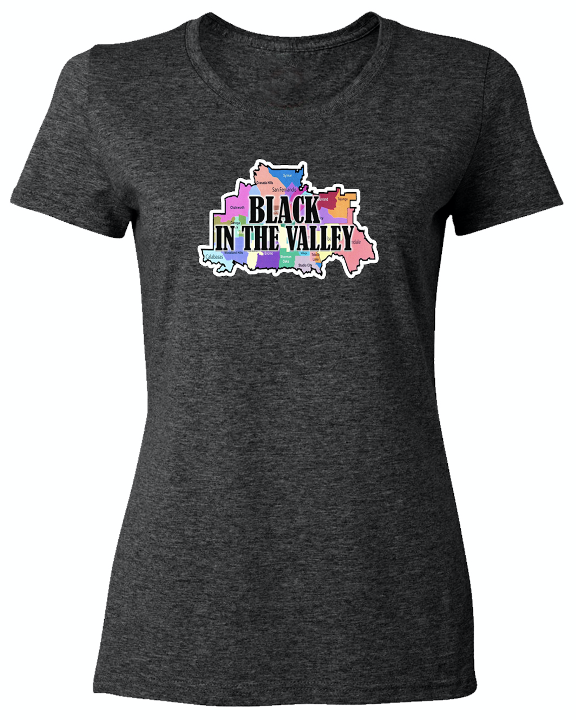 Whether you're from Sherman Oaks or Calabasas you'll look good in this fashionable ladies Black In The Valley T-shirt. Made of 100% soft cotton, it comes in Charcoal Grey and Light Grey with sizes small though XL.